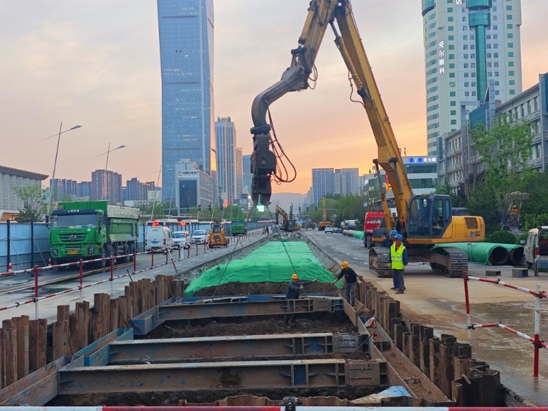 “追求精細(xì)極致,鑄就基坑支護(hù)的穩(wěn)固防線”。項(xiàng)目部將鋼板樁施打質(zhì)量視為確保基坑安全與質(zhì)量的關(guān)鍵環(huán)節(jié),嚴(yán)格執(zhí)行材料準(zhǔn)入制度,所有進(jìn)場(chǎng)鋼板樁均經(jīng)過(guò)材質(zhì)證明核查、尺寸精度測(cè)量和外觀質(zhì)量檢驗(yàn)三重把關(guān),確保樁身無(wú)裂紋、無(wú)銹蝕等質(zhì)量缺陷,從源頭上杜絕不合格材料。施工中,施工人員采用全站儀進(jìn)行動(dòng)態(tài)監(jiān)測(cè),嚴(yán)格控制樁身垂直度偏差在規(guī)定范圍內(nèi),詳細(xì)記錄每根樁的打入深度、貫入度等關(guān)鍵參數(shù)。拔樁階段采用專(zhuān)用施工設(shè)備,按照“先支后拆、分段拔除”的原則有序進(jìn)行,拔樁后出現(xiàn)的孔隙立即灌砂,最大限度減少對(duì)周邊土體的擾動(dòng),實(shí)現(xiàn)平穩(wěn)施工與環(huán)境保護(hù)的和諧統(tǒng)一。