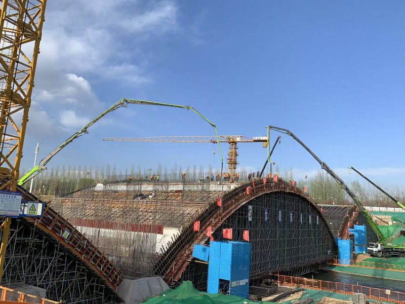 該橋采用單跨72米連續(xù)5跨設計,主腹拱作為橋梁的核心承重結(jié)構,是此次橋梁施工的核心節(jié)點,項目團隊順利克服弧形施工、模板一次成型、大體量澆筑、五跨精準落架等挑戰(zhàn),以“毫米級”精度貫穿施工全過程,為橋梁成型打造堅實“筋骨”。