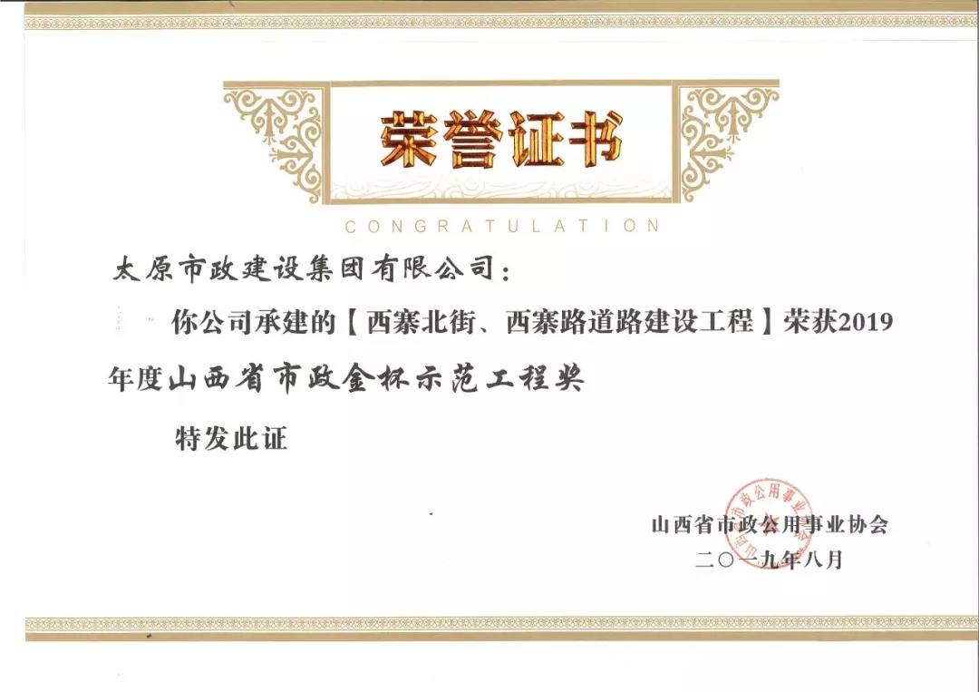 近日,太原市政建設集團有限公司承建的太原市松小線建設工程,新晉祠路(長風西大街-冶峪街)道路改造工程,臥虎山快速路建設工程一標段工程,普國路道路改造工程一標段,西寨北街、西寨路道路建設工程榮獲山西省市政公用事業(yè)協(xié)會頒發(fā)的2019年度“山西省市政金杯示范工程”榮譽稱號。集團公司王愛蓮、劉桂英、李瑞金、閆玲、王根和榮獲2019年度“山西市政工程優(yōu)秀項目經理”榮譽稱號。